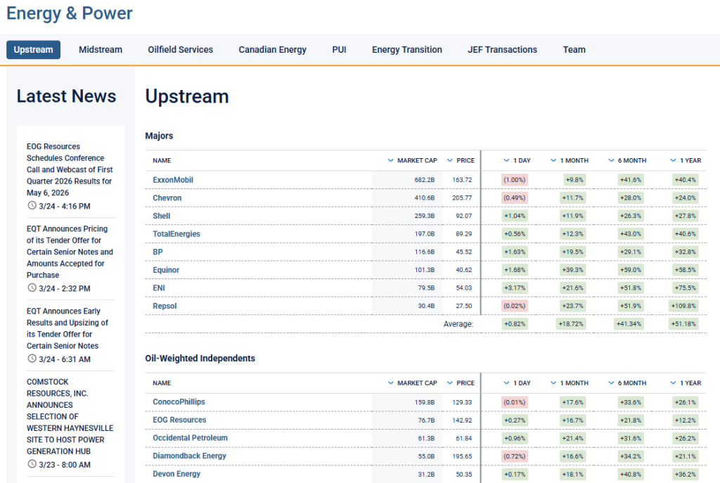 Jefferies Energy & Power introduces a next‑generation market intelligence platform that unifies the energy ecosystem. Access real-time market data by sub-sector across the Energy & Power landscape and stay up-to-date on the latest updates from the Jefferies Energy & Power Group. See our latest transaction updates & insights from the #1 Investment Banking team in Global Energy & Power.