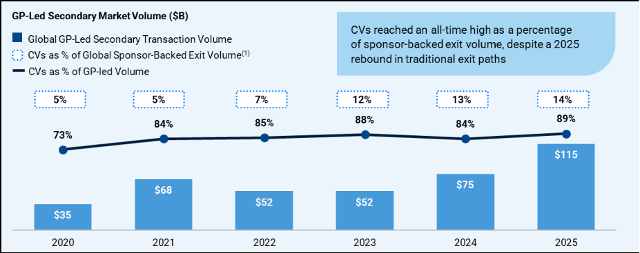 Adoption of CVs also continues to broaden. As of 2025, nearly 80 percent of the top 100 sponsors by assets under management had completed a CV transaction. Even more notably, GP-led secondaries represented approximately 14 percent of all sponsor-backed exit volume in 2025, even as traditional M&A and IPO activity improved in the second half of the year.